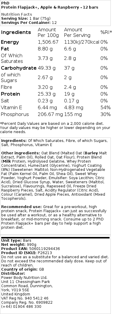 PhD – Protein Flapjack+, æble og hindbær – 12 barer