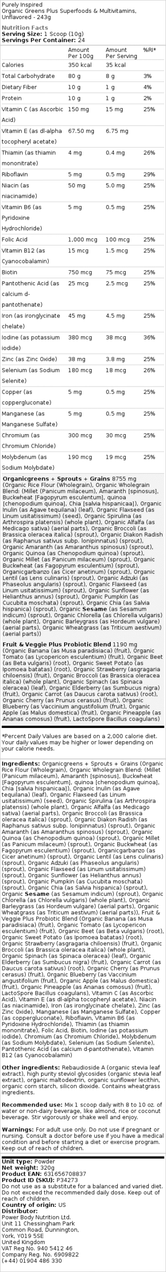 Purely Inspired Organic Greens Plus Superfoods & Multivitamins er en exceptionelt ren blanding, fri for kunstige sødemidler, farvestoffer og konserveringsmidler. Med kun 35 kalorier per portion tilbyder denne formel et rigt udvalg af frugter og grøntsager samt probiotika og 18 essentielle vitaminer og mineraler. Dette produkt er ikke blot certificeret USDA Organic, men også glutenfrit, non-GMO og 100% vegansk! En ideel løsning for at berige din kost med høj kvalitet næringsstoffer.
